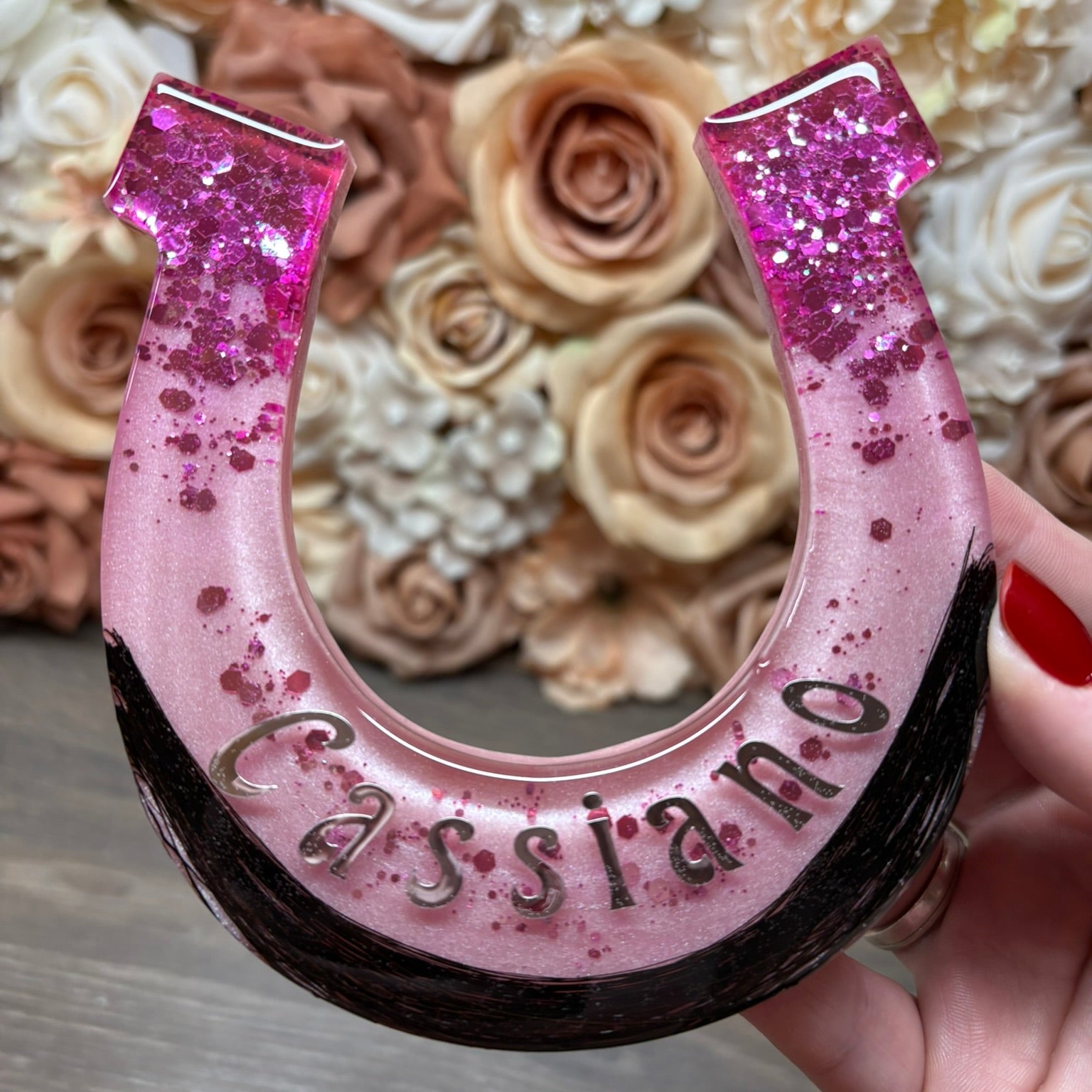 Personalisierbares Hufeisen aus Epoxidharz – mit Schweifhaar & Wunschdesign
